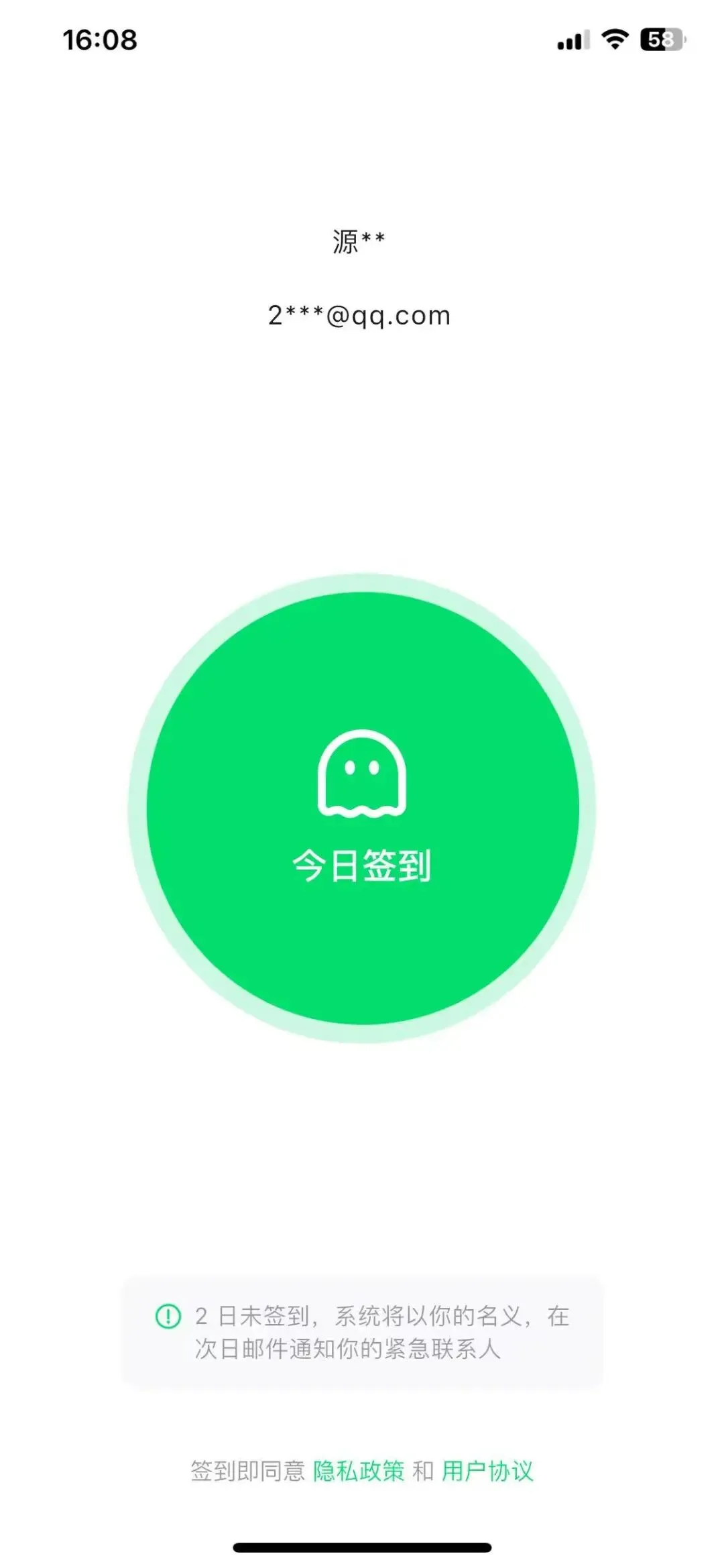 这款应用的页面极为简单,只包含一个醒目的“签到”按钮和一个提示:“2日未签到,系统将以用户的名义,在次日邮件通知用户的紧急联系人。”。