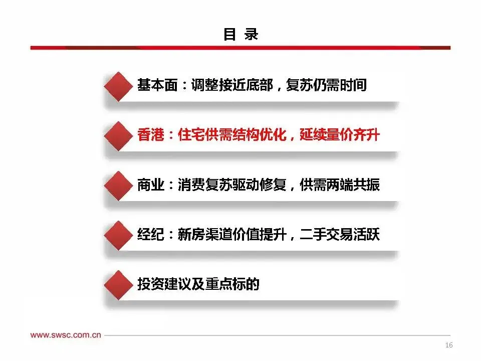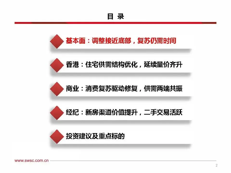 报告提出三大投资主线:一是香港住宅市场,供需结构优化,量价齐升趋势延续,建议关注低估值、高股息的香港住宅业务占比高的公司;二是商业地产,消费复苏驱动修复,购物中心客流企稳,建议关注由开发转型商业的优质企业;三是房地产经纪行业,新房渠道价值提升,二手交易活跃,建议关注龙头平台及区域深耕标的。