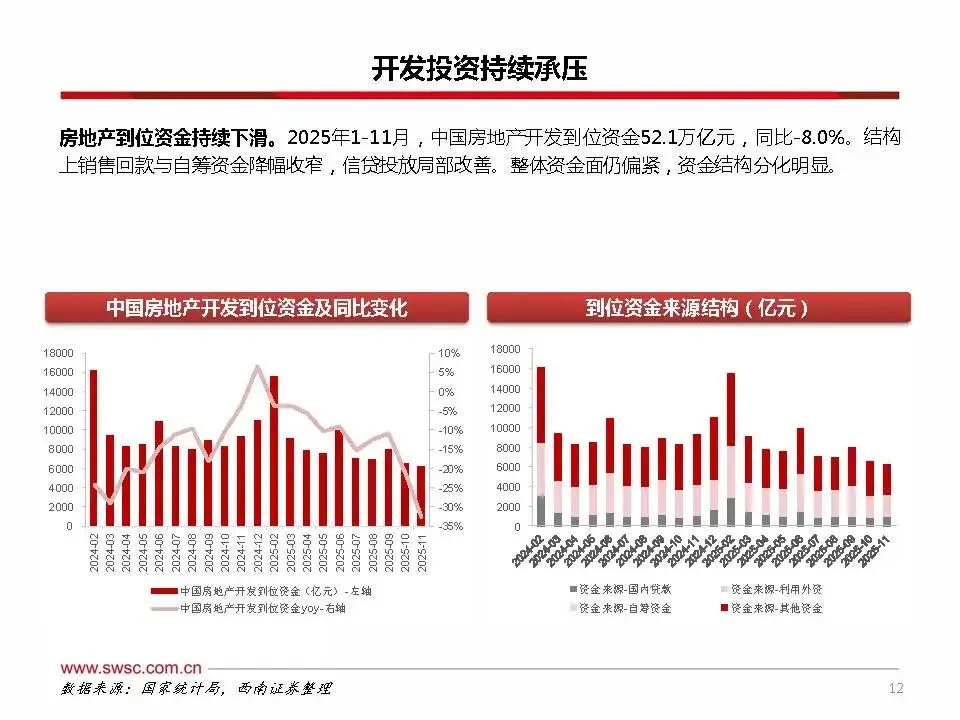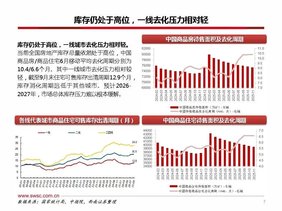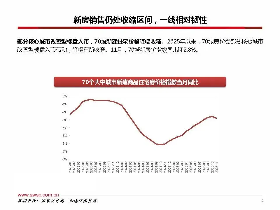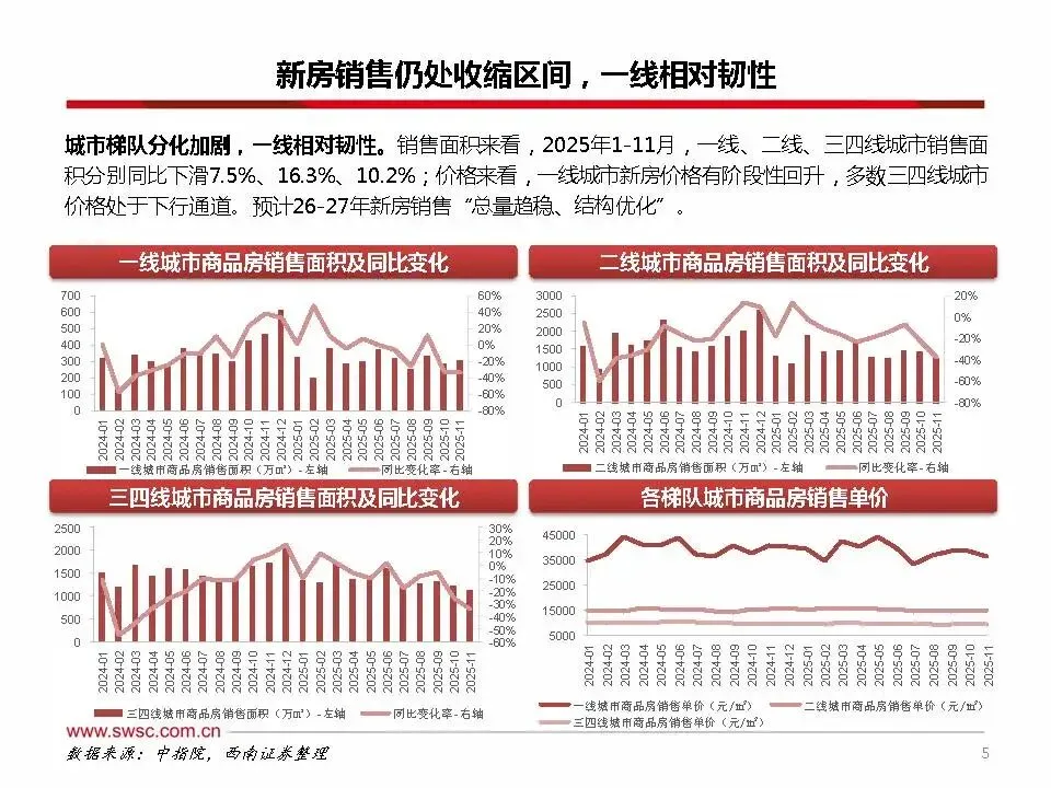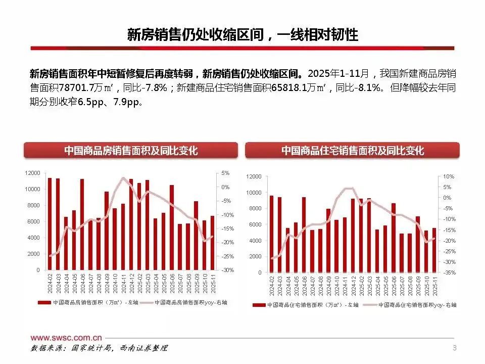 报告指出,2025年房地产行业仍处于调整期,新房销售面积同比下滑7.8%,但降幅有所收窄,城市分化加剧,一线城市相对韧性较强。