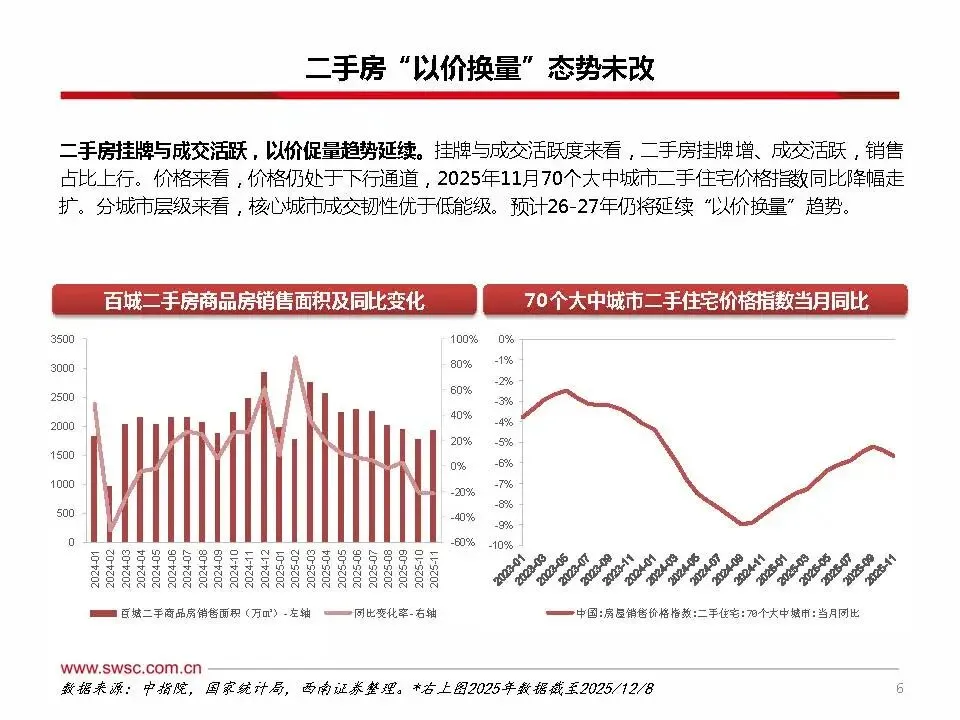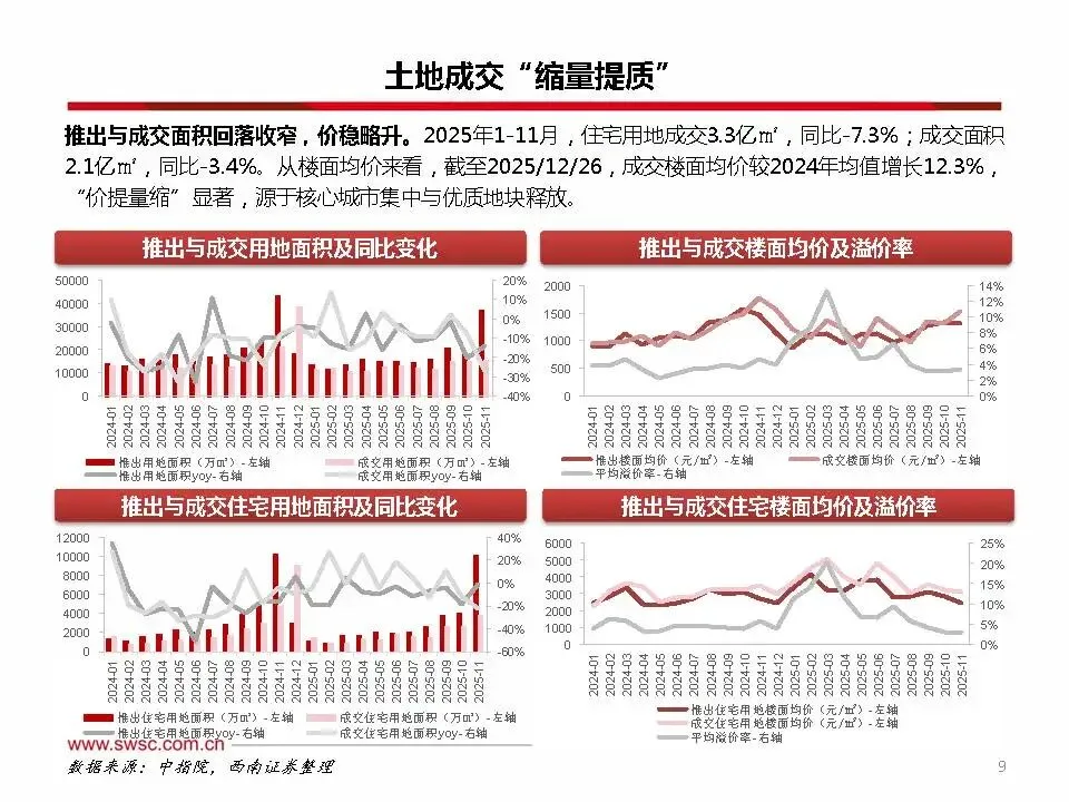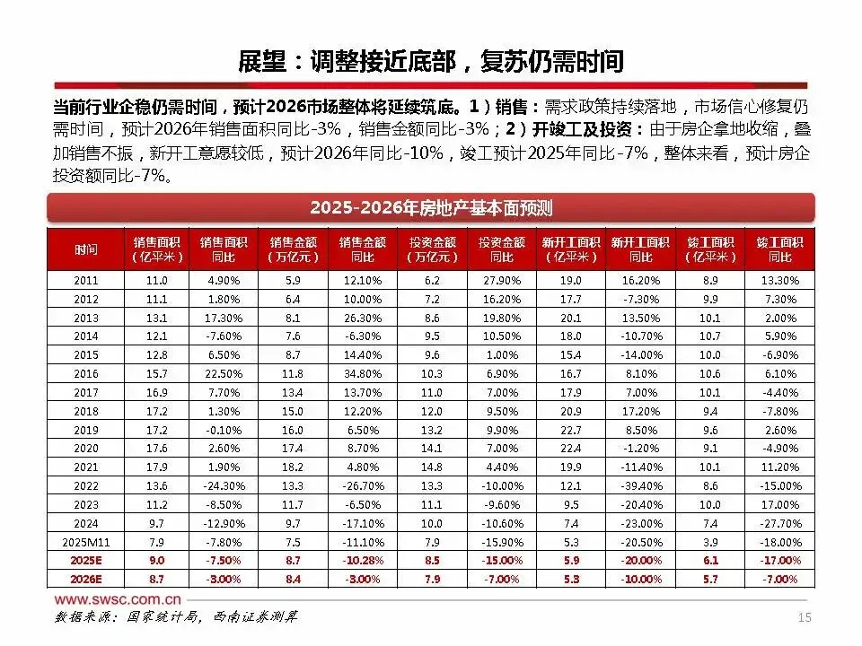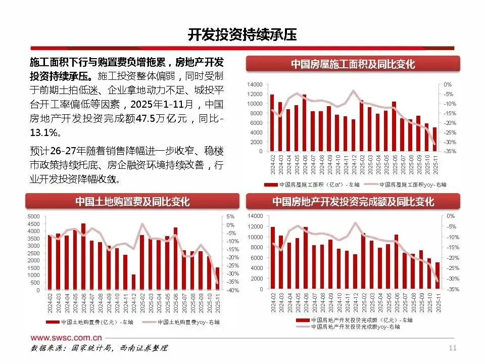 报告预测,2026年房地产行业将继续筑底,销售面积和金额同比降幅收窄至3%,新开工面积同比下降10%,投资额同比下降7%。