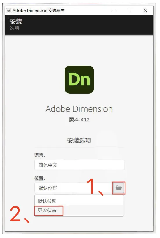 点击文件夹图标展开,点击:更改位置,建议安装在D盘(路径不能有中文等特殊字符)。