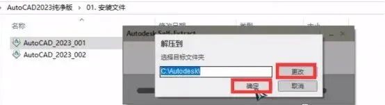 3、打开安装文件,鼠标双击【AutoCAD_2023_001】,显示解压到,可以更改换个除了C盘以外的盘中,再点击确定。
