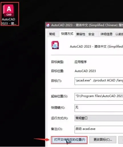 10、找到桌面的CAD2023快捷方式,右键,属性,点击【打开文件所在的位置】。
