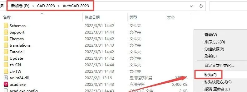 11、在打开的文件夹空白处,鼠标右键“粘贴”刚才复制的“AutoCAD2023-2022-2021Patch.exe”文件