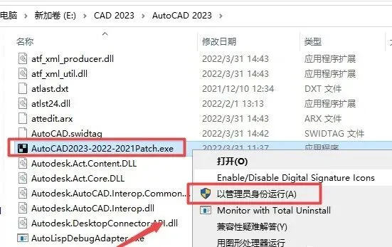 12、找到并选中复制过来的“AutoCAD2023-2022-2021Patch.exe”文件,鼠标右键选择“以管理员身份运行