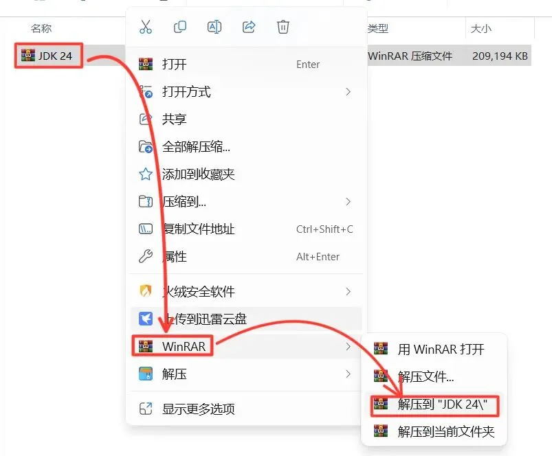 1.打开下载的JDK 24安装包,鼠标右击压缩包选择【解压到 JDK 24\】。