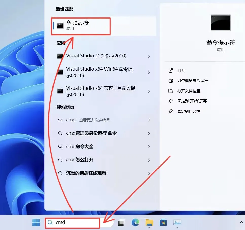 8.在任务栏搜索框中输入【cmd】,点击【命令提示符】。