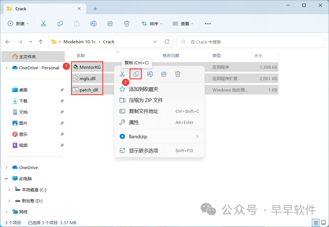 16、回到Modelsim 10.1c文件夹下的Crack文件夹,选中全部文件,再右键点击【复制按钮】