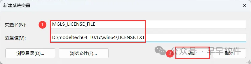 32、变量名输入:MGLS_LICENSE_FILE;变量值输入:D:\modeltech64_10.1c\win64\LICENSE.TXT,再点击【确定】