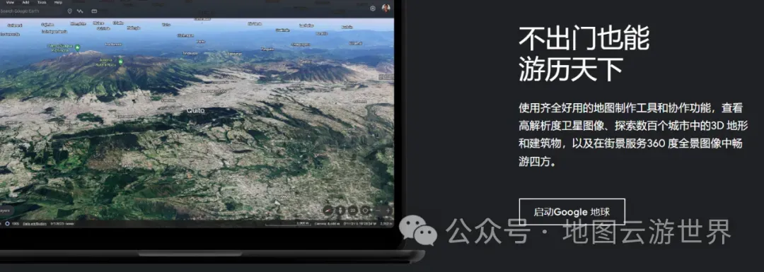 用户可以通过输入地址、坐标,或者利用键盘和鼠标来探索地球,并可查看高分辨率的卫星图像、3D地形和建筑物模型,以及街景服务提供的360度全景图像。