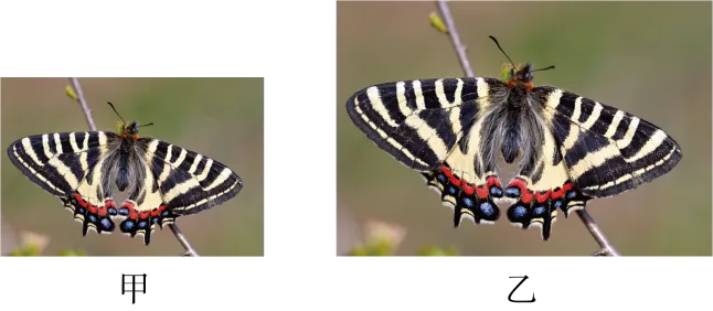 12. 蝴蝶研究专家章丽晖在茅山首次发现国家二级保护动物——中华虎凤蝶,他先用相机拍摄了蝴蝶休憩的照片甲,为了拍摄照片乙,应( )
