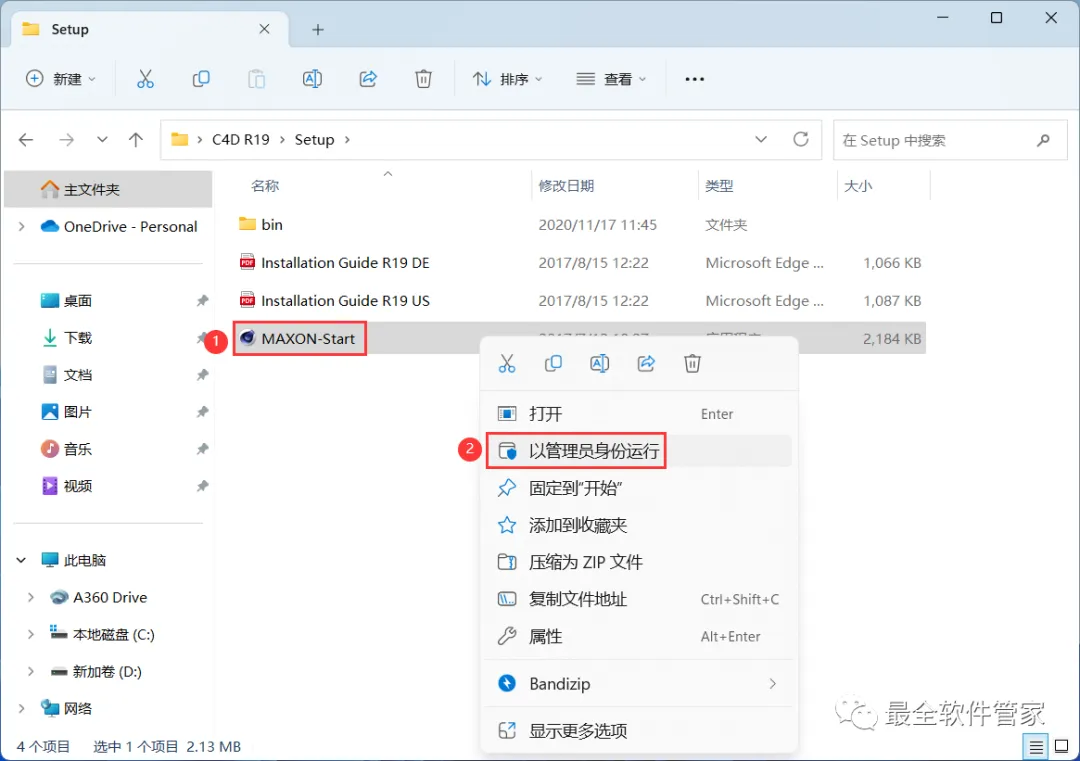 4、找到【MAXON-Start】应用程序,右键选择【以管理员身份运行】它
