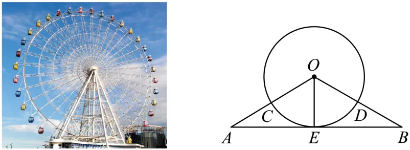 14. 摩天轮是游乐园里非常受欢迎的项目之一.如示意图,等腰三角形的底边与相切于点,腰分别与交于点,此时点恰好是的中点.若的半径为,则扇形的面积为______.(结果保留π)