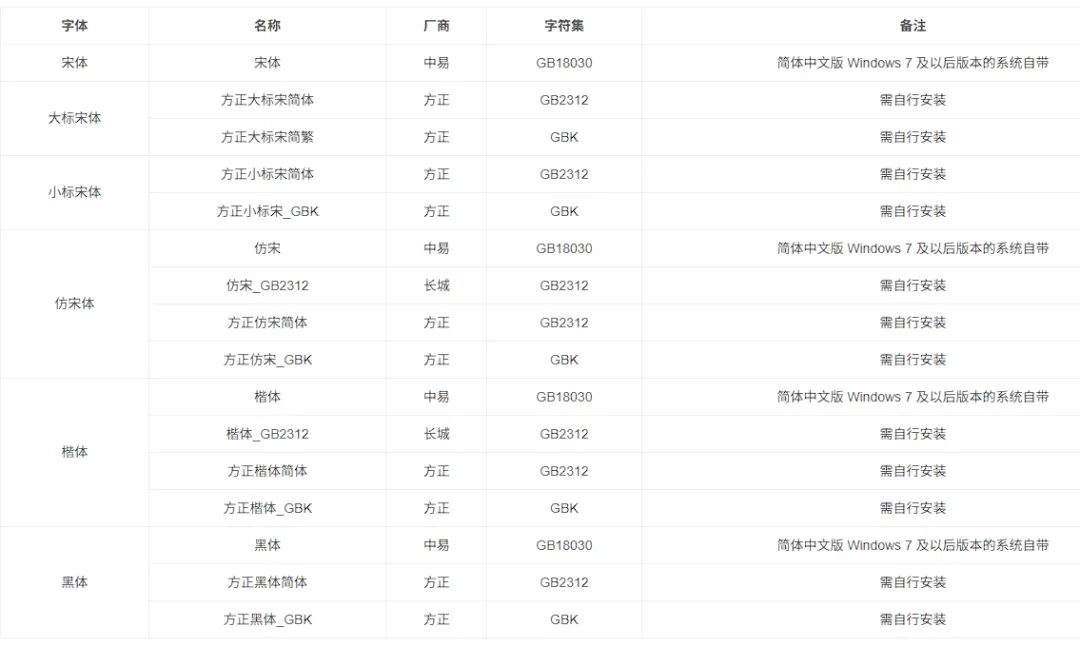 宋体 方正大标宋简体 方正大标宋简繁 方正小标宋简体 方正小标宋GBK