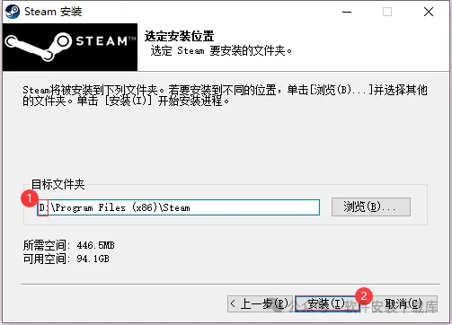 | 1.找到下载好的SteamSetup安装包,双击打开2.点击"下一步"3.继续点击"下一步"4.修改路径地址中的第一个字符C可设置用户文件目录(如:把C改为D软件目录将存储到D盘),点击【安装】。 |