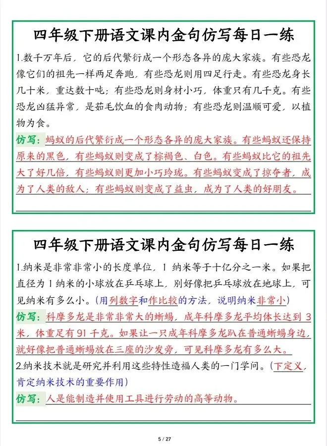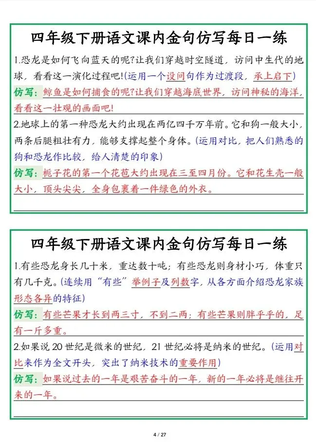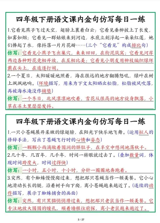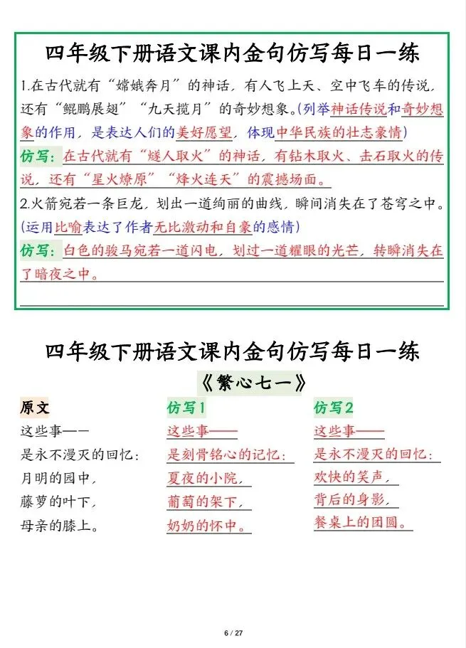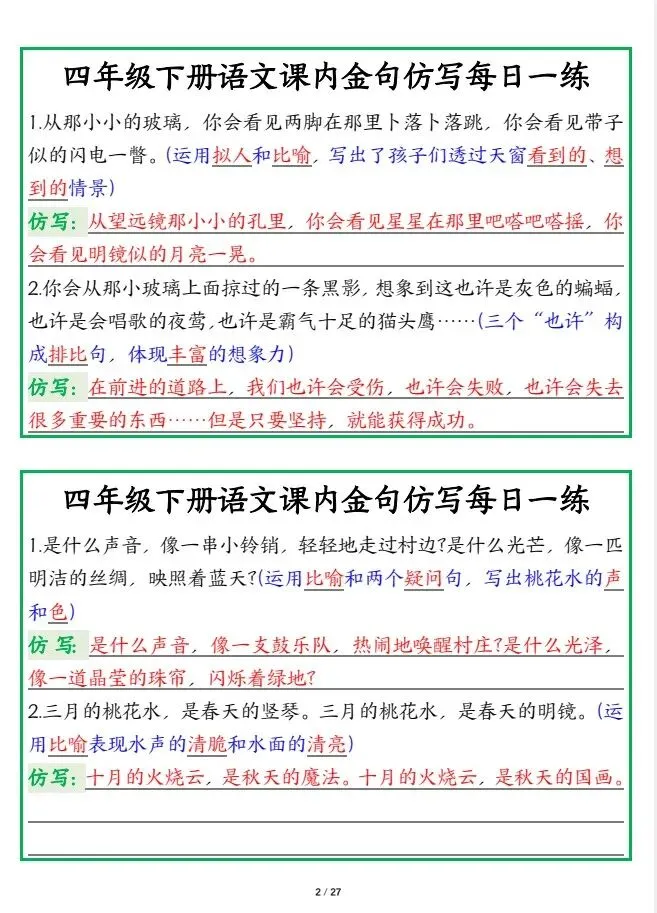 文末免费下载|四年级下册语文【课内金句仿写每日一练空白+答案版】
