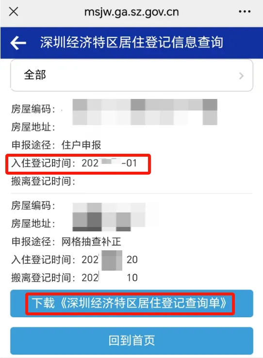 人脸认证后,就能查询到自己的居住登记信息,可以看到“入住登记时间”是几几年几月几号,点击“下载《深圳经济特区居住登记查询单》”