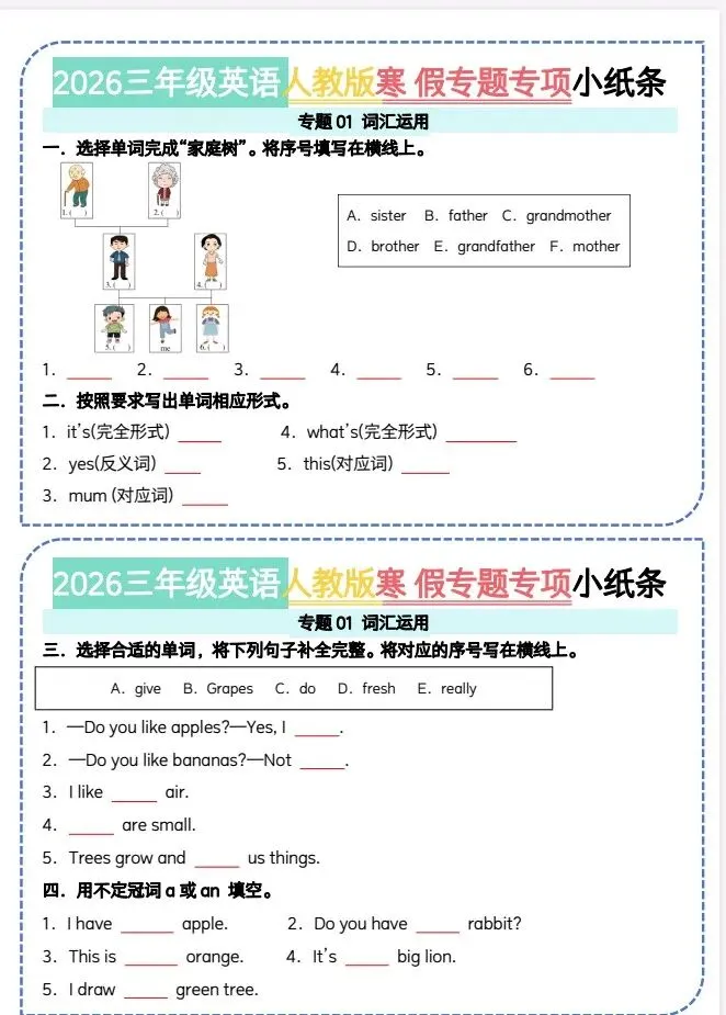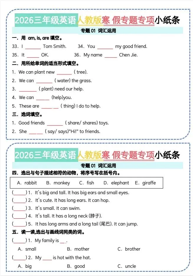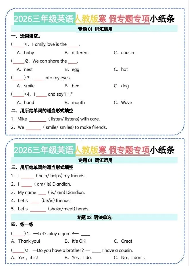 文末免费下载|26三年级英语人教版寒假作业专题小纸条