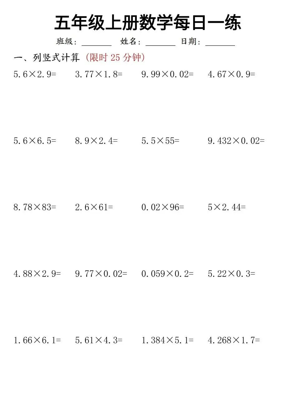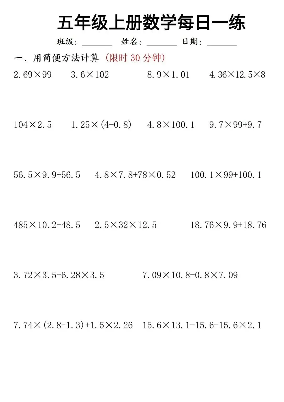 五年级上册数学|每日一练(竖式计算、简便方法计算)(高清下载打印)