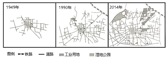 甘肃省张掖市位于河西走廊中部,下图示意张掖市区路网和工业用地的变化。据此完成下面小题。