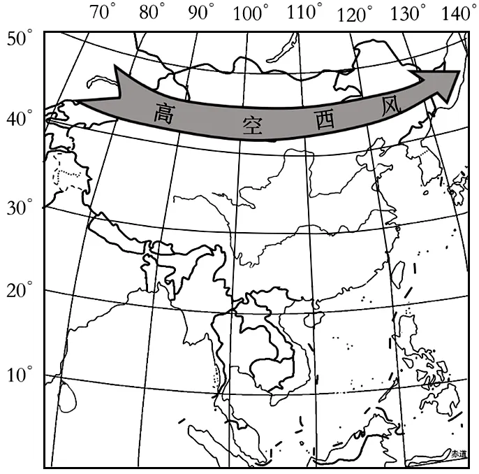 研究表明,中纬西风厚度从近地面可达对流层的上部,受海陆热力性质差异影响,近地面西风带会被破坏。下图示意亚洲部分地区某季节高空(海拔约5500米高度)西风的位置。据此完成下面小题。