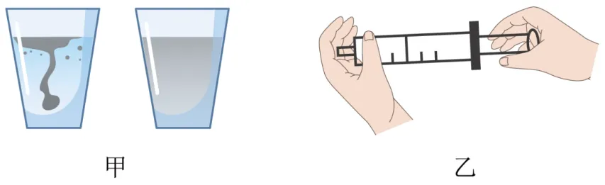 14. 晓雯将几滴蓝墨水滴入一杯水中,如图甲所示,观察到整杯水慢慢变蓝,这种现象说明分子在 _____ ;晓军同学先将注射器筒内吸入适量的水,推动活塞使筒内空气排除后,用手指堵住注射器嘴,再用力推活塞,如图乙所示,结果发现筒内水的体积几乎未改变,这一现象表明分子间存在着相互作用的 ________ 。