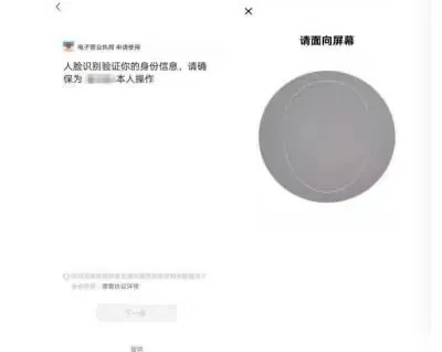 申请使用电子营业执照,需要阅读并同意《个人信息处理规则》,然后点击 【下一步】。出现人脸识别页面,根据页面要求进行操作,完成人脸识别,实名认证的操作就完成了。