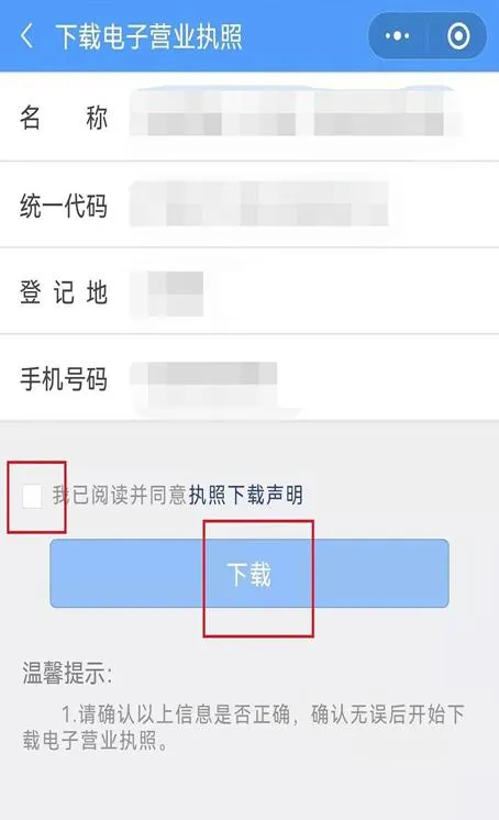 4.下载电子营业执照,需要阅读并同意《执照下载声明》,然后点击【下载】。(如果小程序上修改过密码,下载时需要输入修改后的密码。)