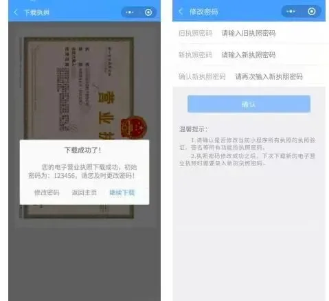5.执照下载成功后,可以继续下载其他的执照;也可以修改本手机小程序里已经下载的所有执照的密码,或者返回主页进行其他的操作。