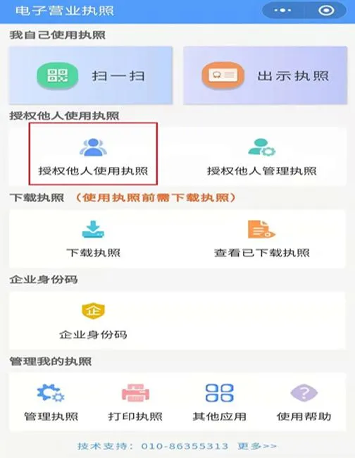第一步在实名认证完成后,进入电子营业执照的首页,点击【授权他人使用执照】。