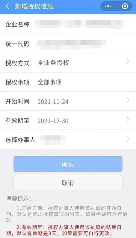 第二步选择【授权方式】和【授权事项】,指定授权【开始时间】和【结束时间】,办事人领取该执照后,可以在执照有效期内办理与该授权事项相关的各项业务。在授权信息列表点击某一授权事项是【详细信息】可以查看该授权事项的详细信息,也可进行取消授权操作;授权被取消后办事人下载的该执照将被失效。