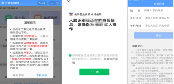 2.点击下载执照,输入法定代表人的姓名、身份证号、手机号,进行人脸识别,完成实名登记。