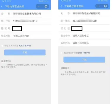 4. 下载电子营业执照前,需要阅读并同意《执照下载声明》。如果本小程序上修改过密码,下载时需要输入修改后的密码。