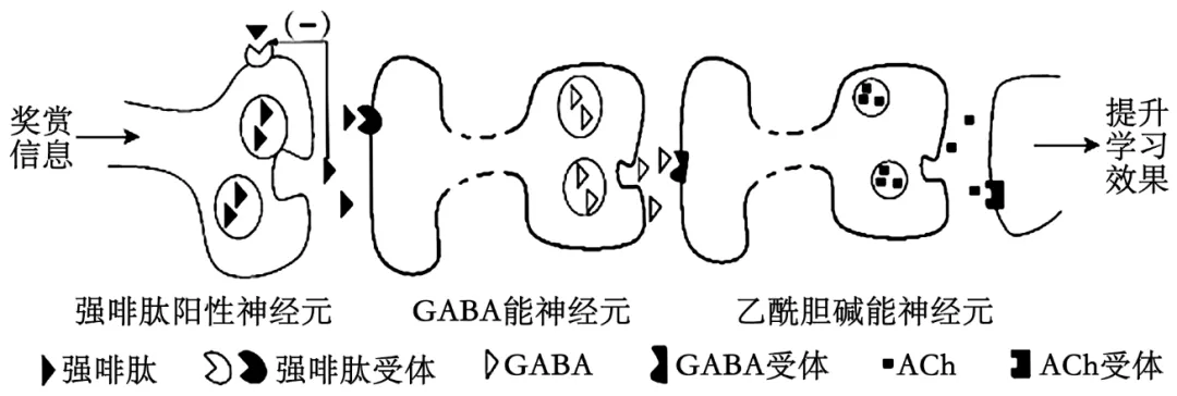10.乙酰胆碱(ACh)可在多条神经调节通路中发挥作用。研究发现,小鼠获得奖赏时,强啡肽阳性神经元会释放强啡肽,通过图示通路促进ACh的释放,提升学习效果。GABA是一种抑制性神经递质,能抑制ACh的释放。在奖赏信息刺激下,下列推测合理的是( )