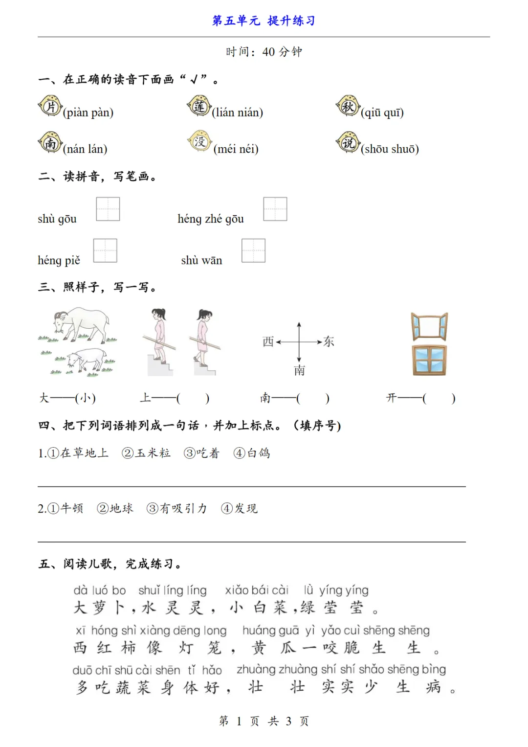 新一年级上册语文第五单元提升练习3页