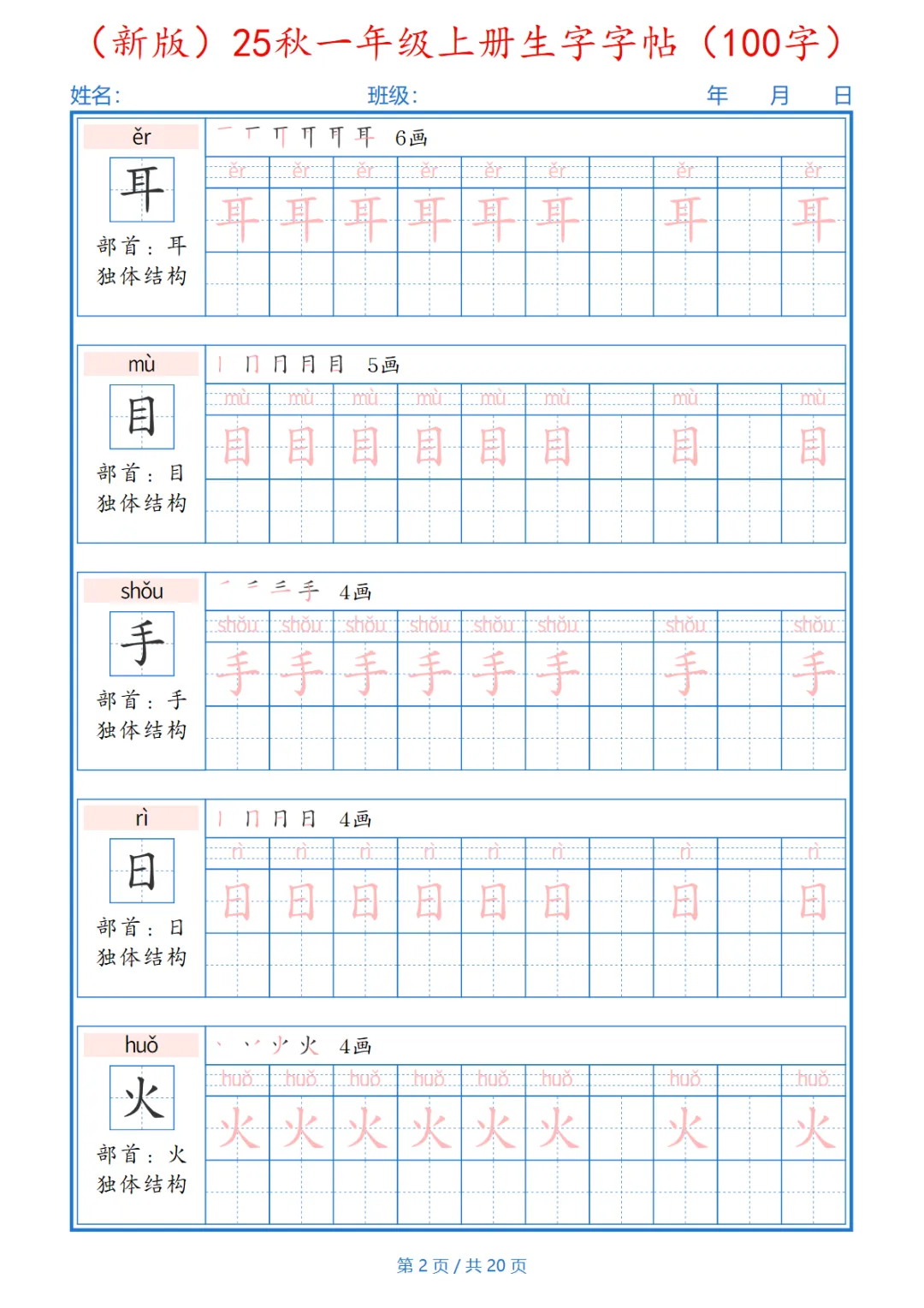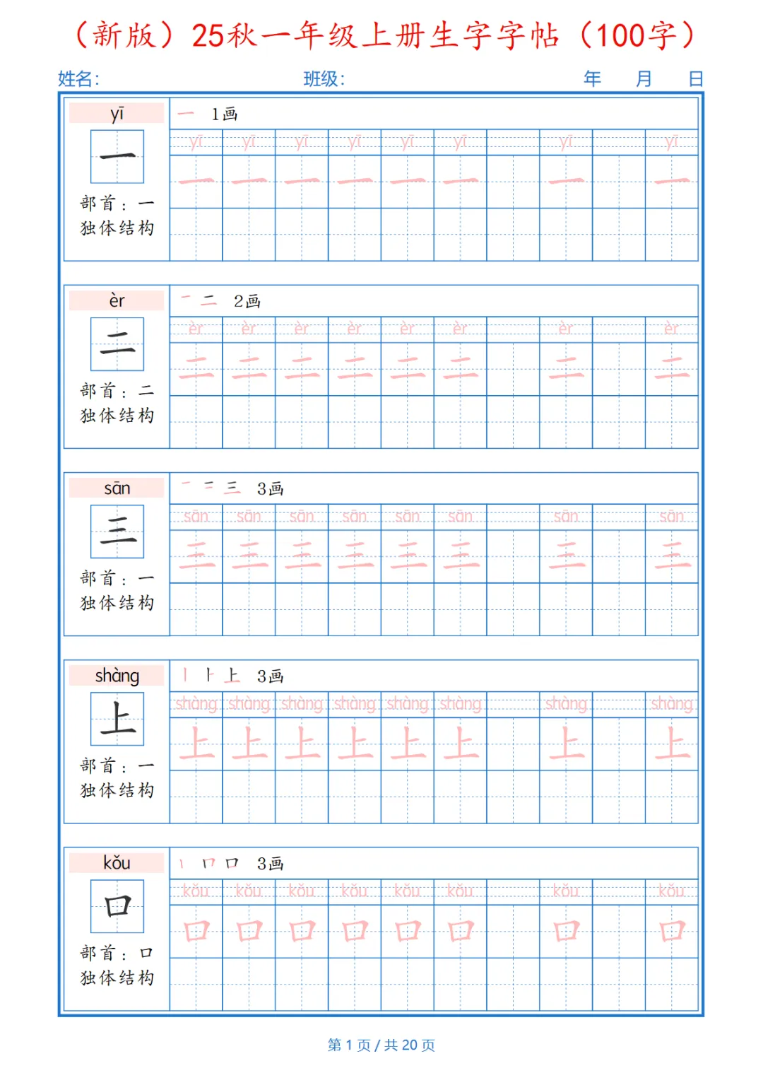 (新版)25秋一年级上册语文生字字帖(100字)