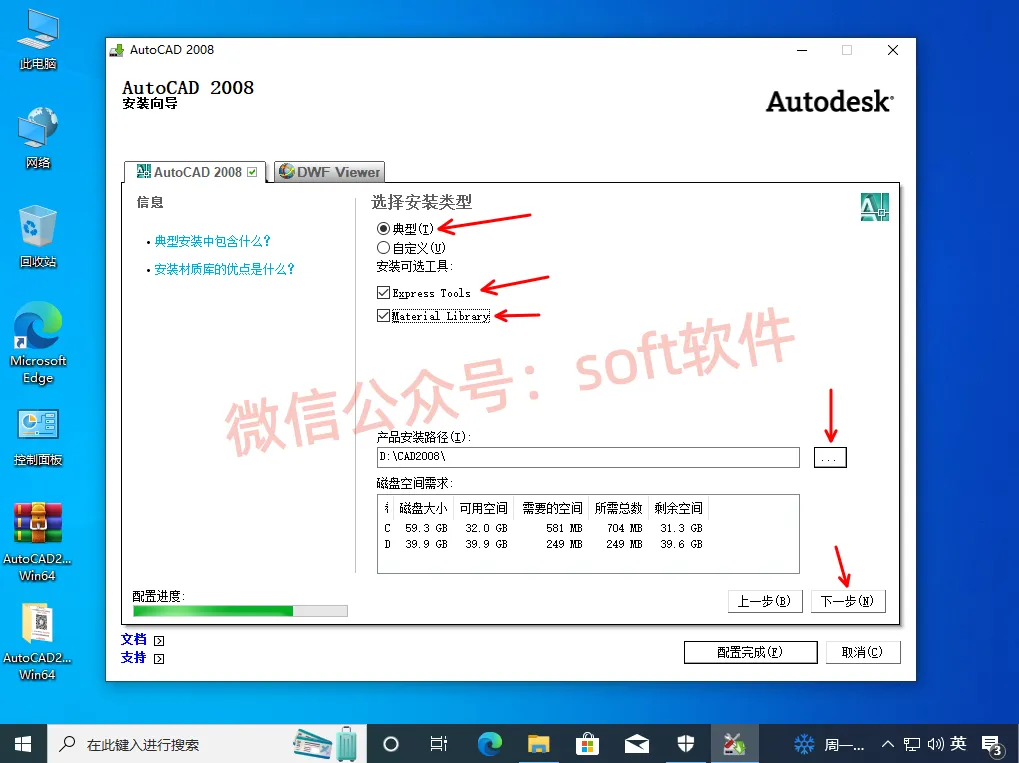 11,选典型,勾选下面两个选项,点...可更改安装路径。更改之后点下一步