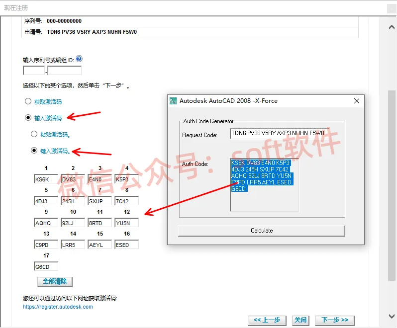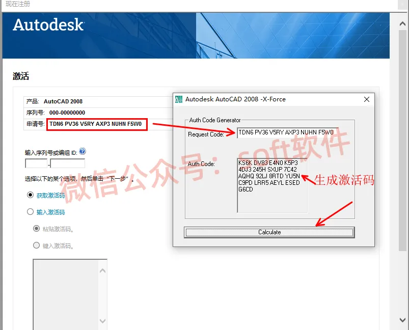 19,将程序窗口的申请号选中,按Ctrl+C复制,然后Ctrl+V粘贴到Request Code里面。然后点Calculate会生成激活码