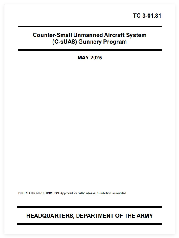 2025年5月美军联合部队发布了其权威战术条令《TC 3-01.81 反小型无人机系统炮术计划》。该文件的出台,标志着应对日益增长的商用与改装小型无人机威胁的战术与技术已进入系统化、标准化阶段,为全球反无人机领域提供了极具参考价值的官方指导框架。