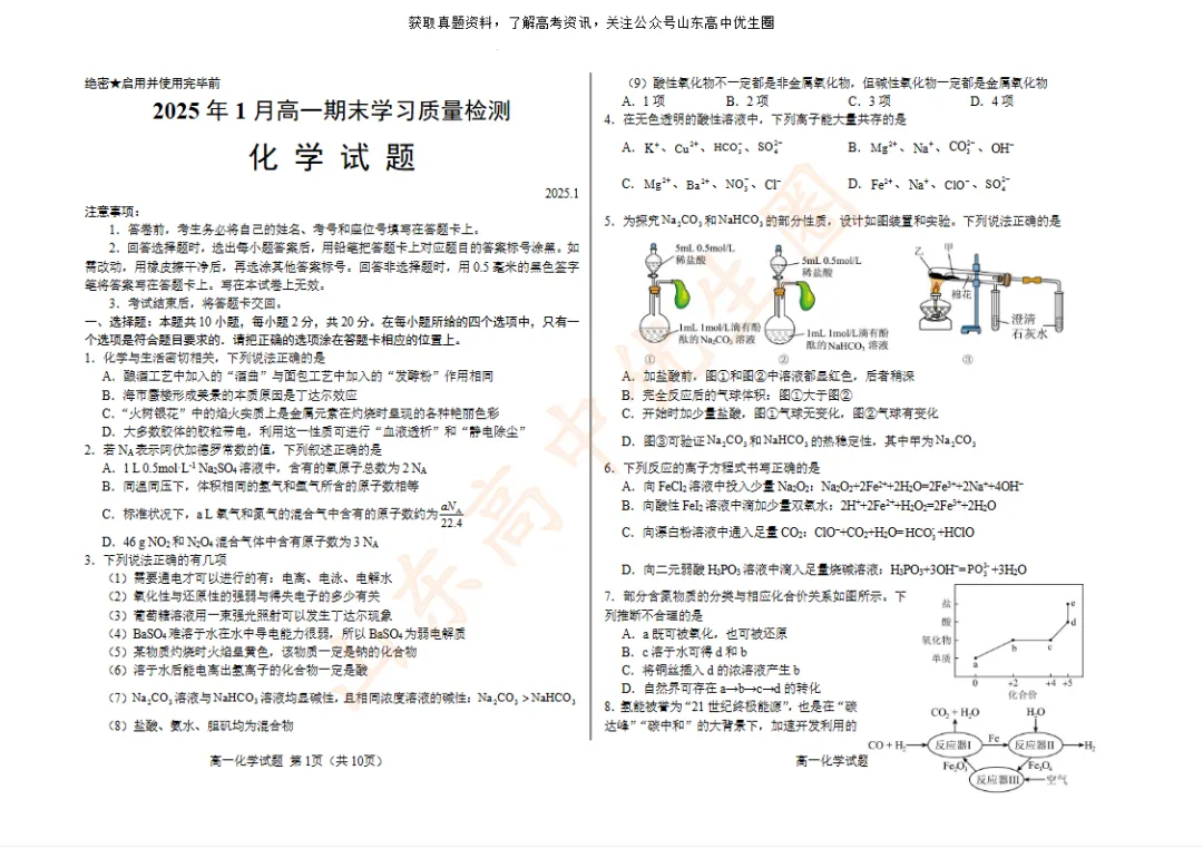 >【免费下载】25学年高一期末化学模拟试题,可打印