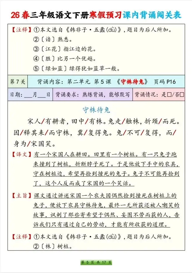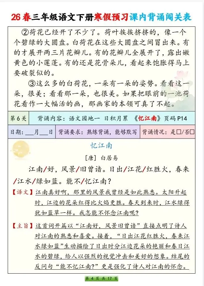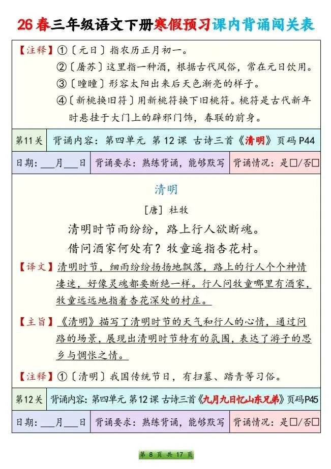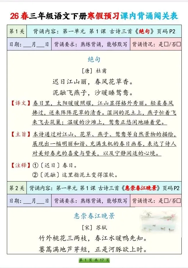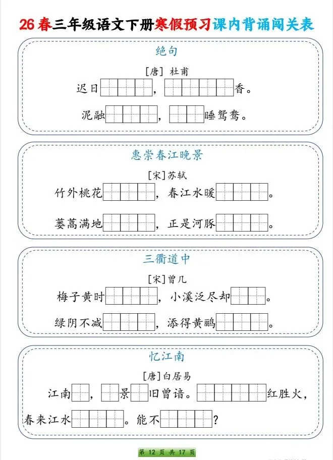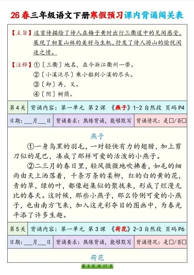 今天给大家整理了26春三年级语文下册 寒假预习课内背诵闯关表,转发给朋友或班级群,受益更多人,帮助孩子学习!