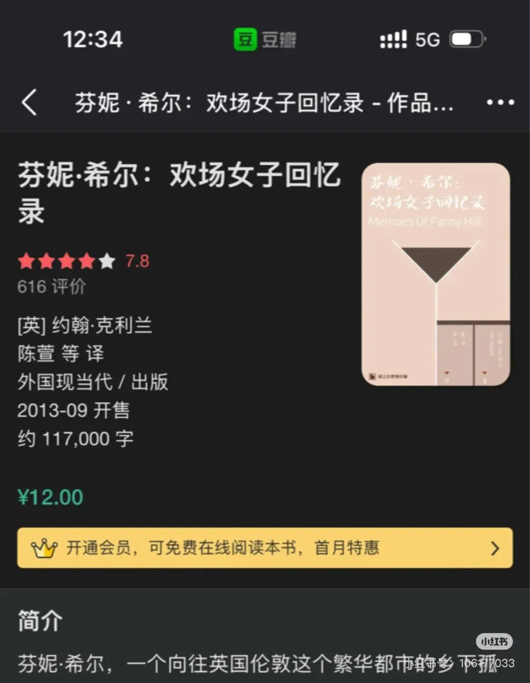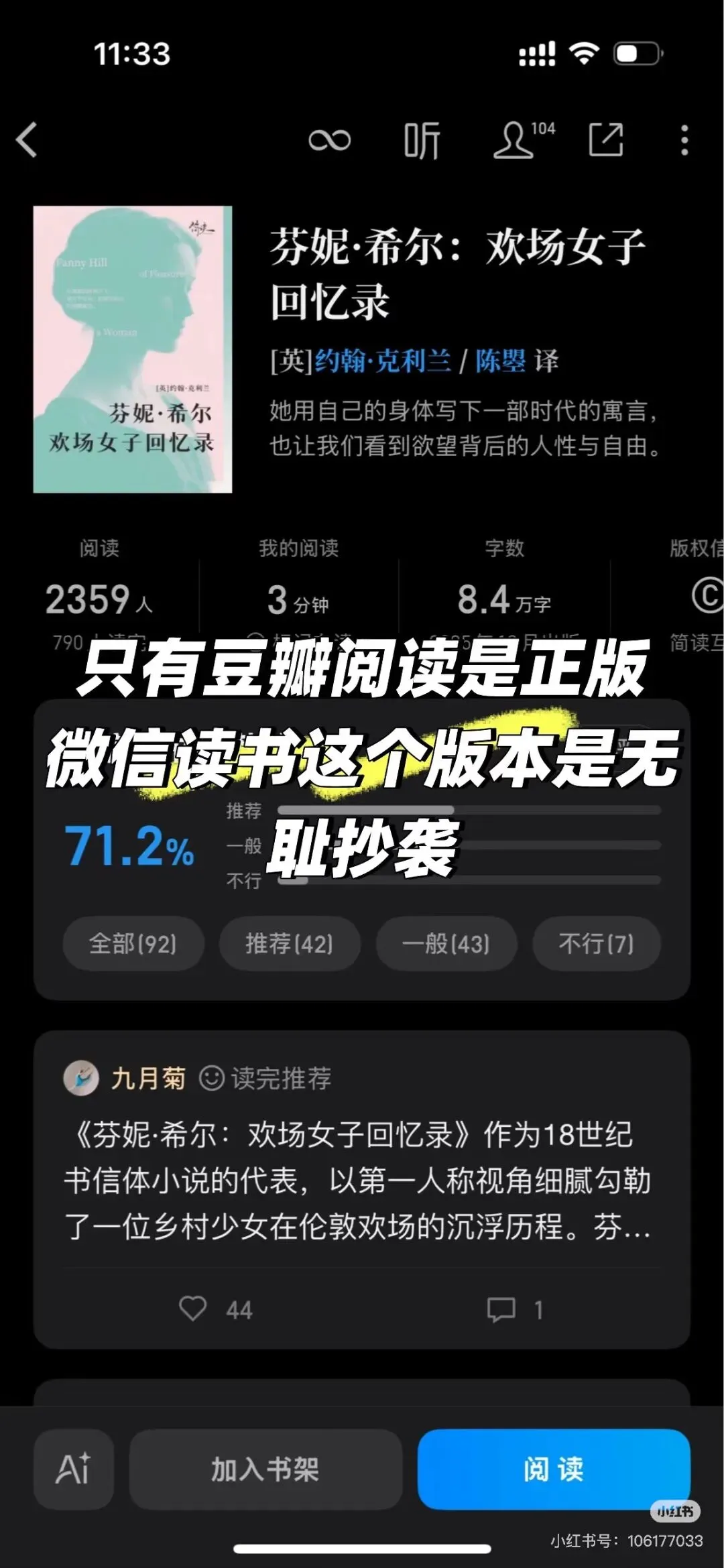 微信读书也曾出现过读者自己上传的我和夏奇合译的《芬妮·希尔》,后来又出现了简读互动文化制作的署名为陈曌的洗稿版《芬妮·希尔》见图2我翻译的《芬妮·希尔》被微信读书上架的盗版惯犯简读互动洗稿了,我们目前还在维权(我小红书上点击率三万的维权帖已经无法显示了)。
