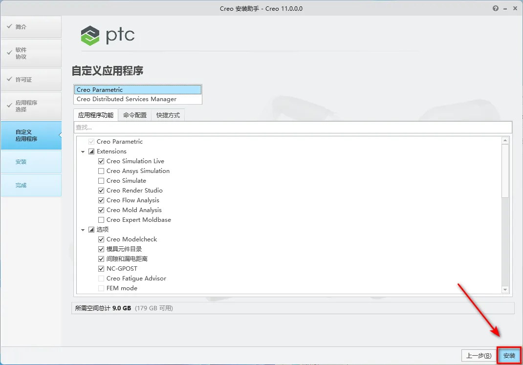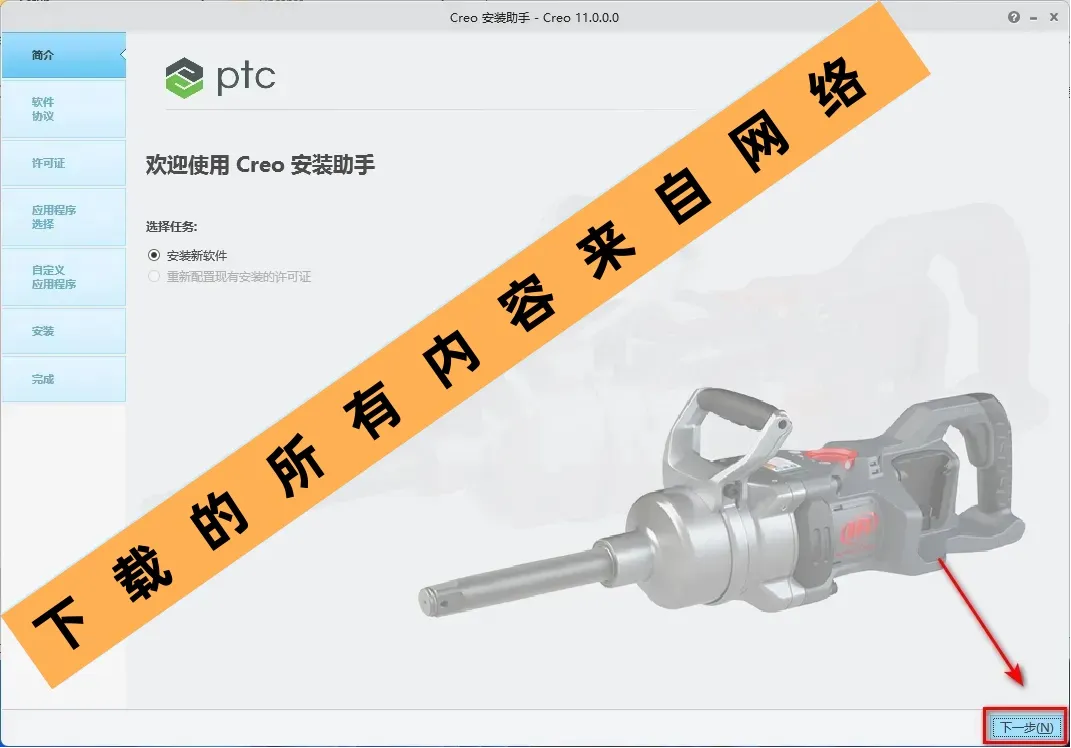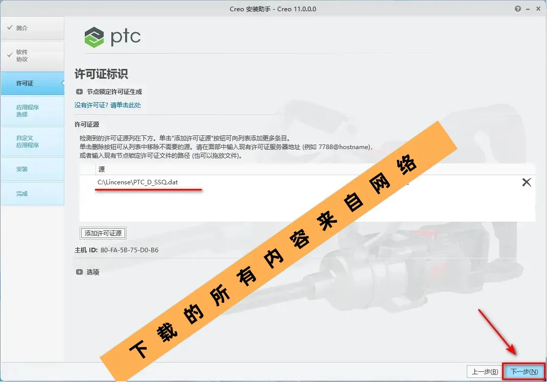 17.通常会自动填充许可证文件的路径,如果没有请手动选择步骤8生成的PTC_D_SSQ.dat文件,路径为:C:\Lincense\PTC_D_SSQ.dat,点击“下一步”