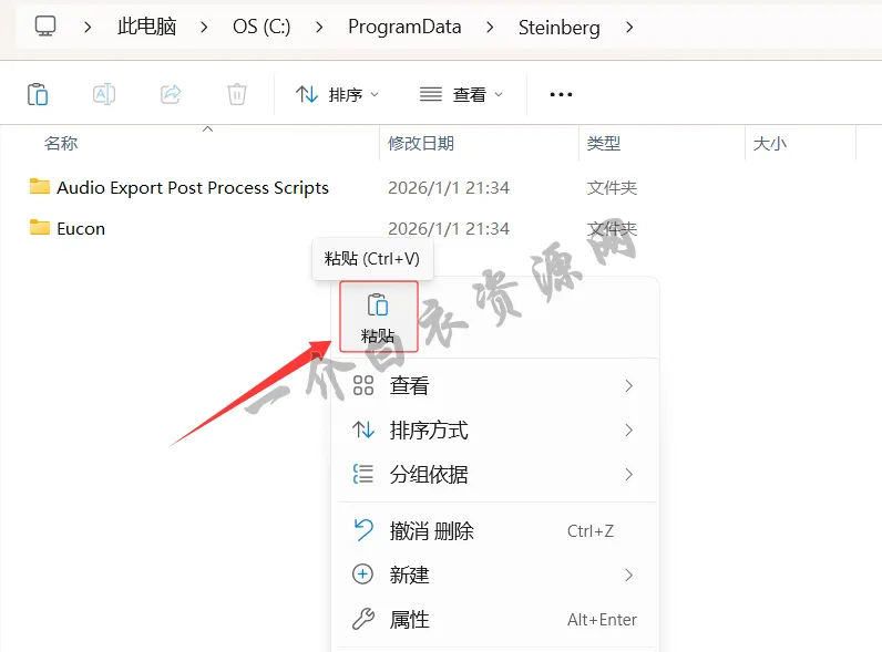 】,在打开的文件夹空白处点击右键,将上一步复制的文件夹,粘贴到此文件夹内