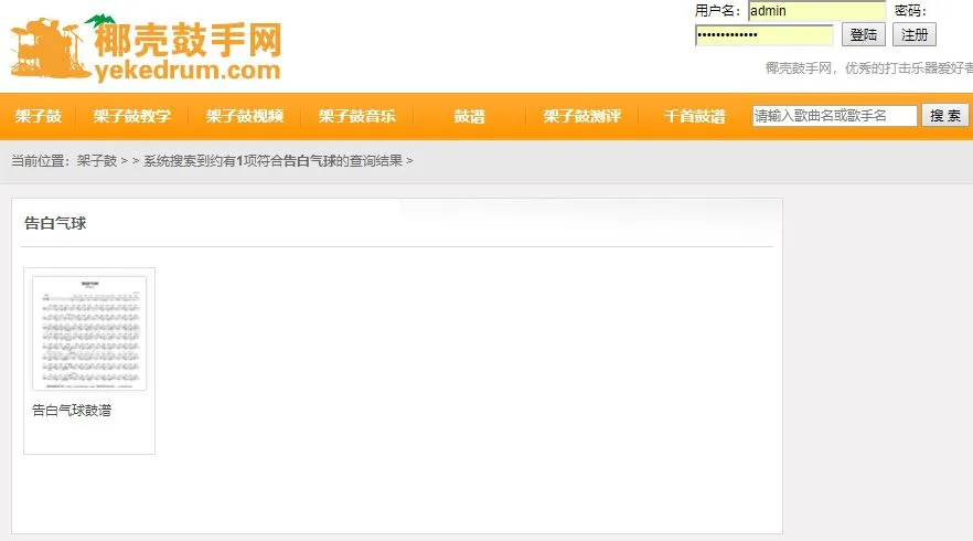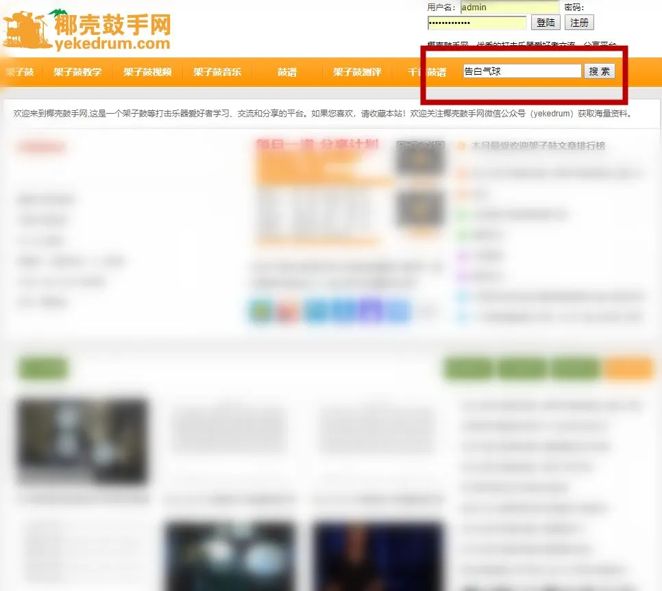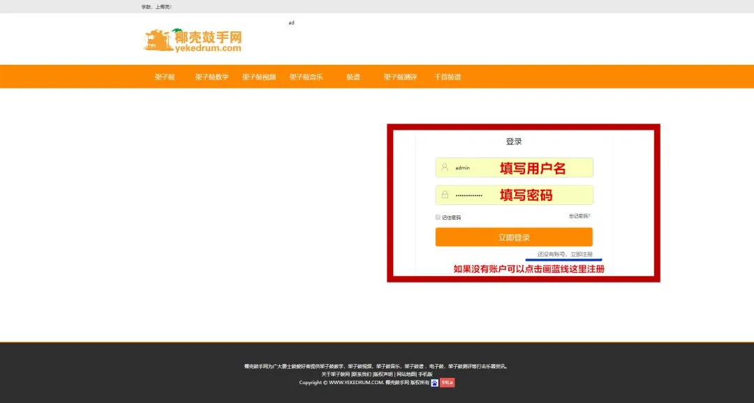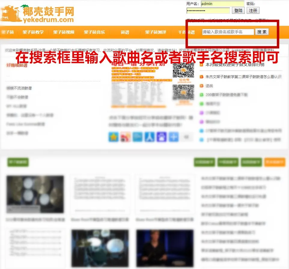 1,首先在浏览器打开网站(输入网址www.yekedrum.com或者在搜索引擎搜索椰壳鼓手网进入)