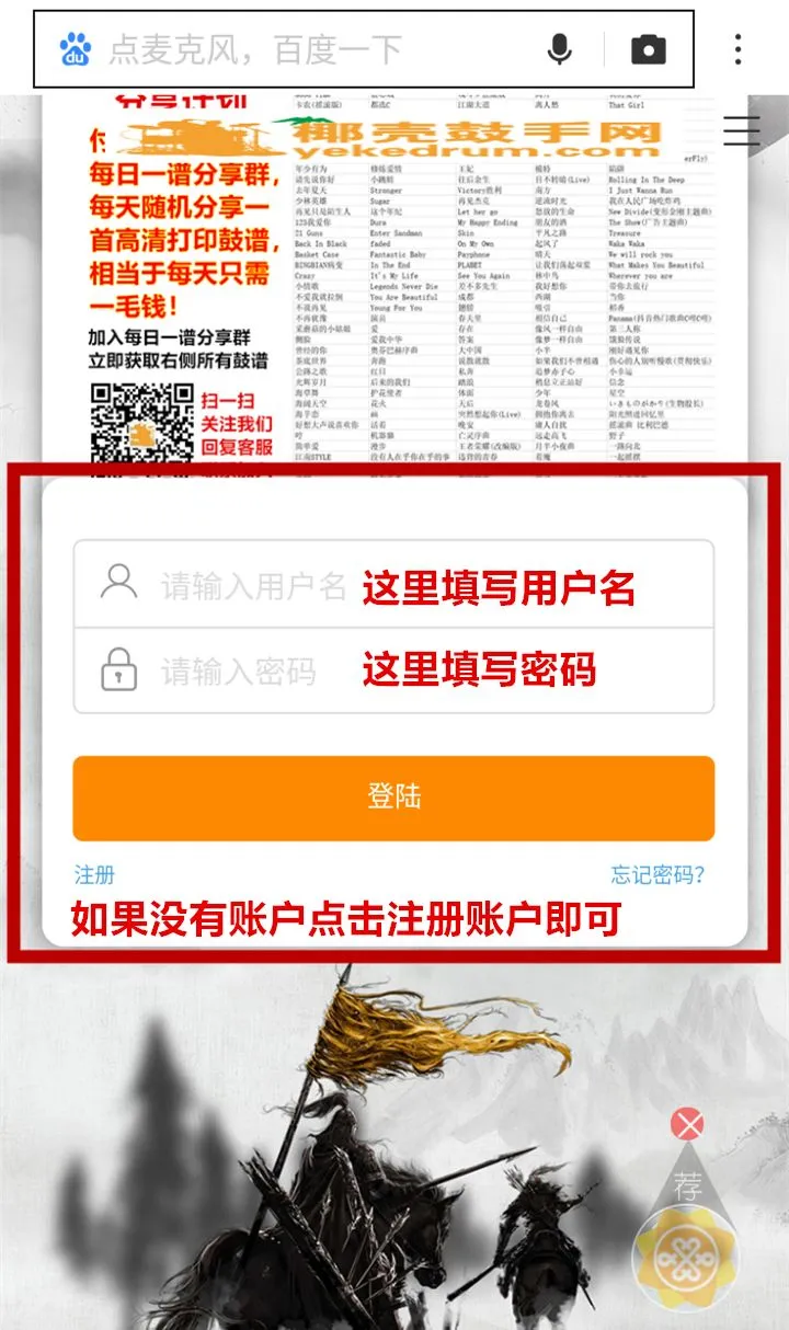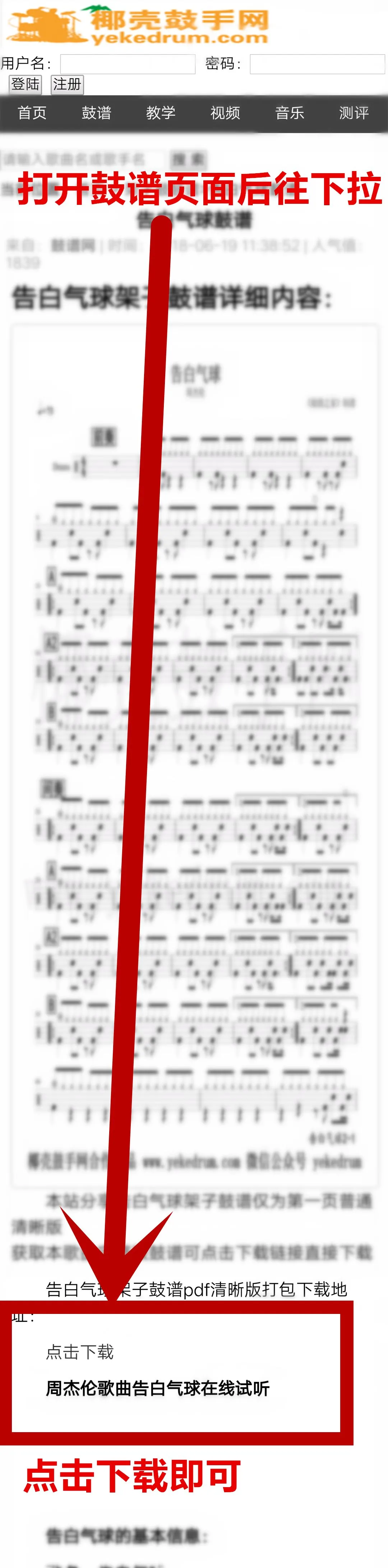 4,下拉网页找到(点击下载),免费鼓谱下载需要会员积分,点击进入会员登录页面,如下图