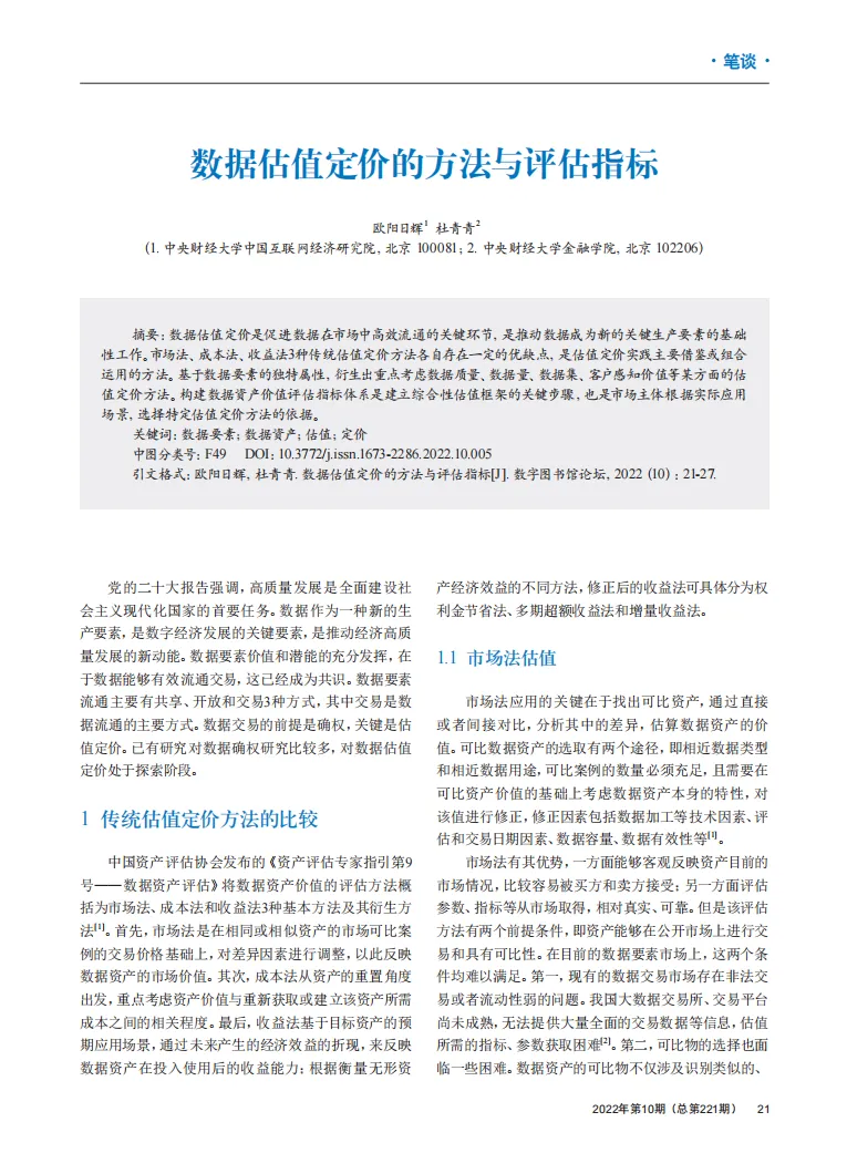 最后,放上中央财经大家欧阳教授在22年写的一篇论文《数据估值定价的方法与评估指标》。数据估值定价的方法与评估指标.pdf