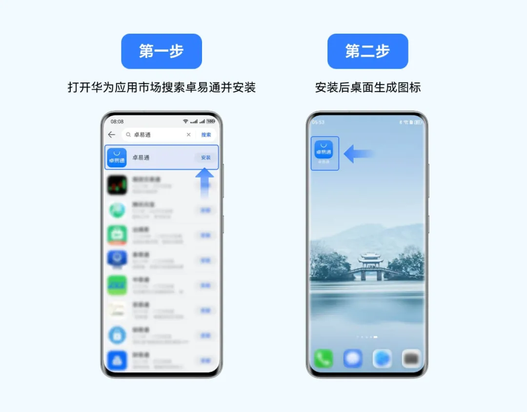 打开华为应用市场App,进入应用或探索界面,在搜索框中输入卓易通,点击搜索,在搜索结果中点击卓易通右边的安装按钮进行应用下载和安装。