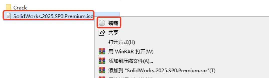 -装载镜像文件:右键解压后的【SolidWorks 2025】镜像文件,选择 “装载”;若没有 “装载” 选项,选择用 Windows 资源管理器打开。