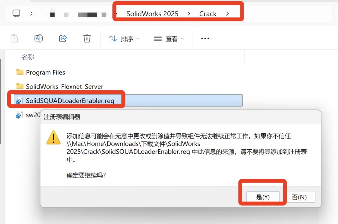 -运行破解文件:再次进入【Crack】文件夹,双击【SolidSQUAD…】文件,弹出提示依次点击 “是” 和 “确定”。
